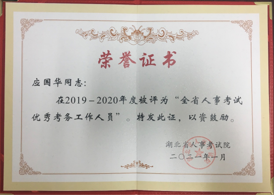 近日,湖北省人事考试院公布了2019-2020年度省人事考试省直优秀考点名单,我校喜获“省直优秀考点”荣誉称号,这是我校继2017-2018年度获武汉市优秀考点后的又一殊荣。教务处应国华、王菲菲同志被授予“省直优秀考务工作者”称号。同期,湖北省教育考试院也公布2018-2019年度非学历证书考试考点评选,我校获“全国大学英语四、六级考试优秀考点”称号,杨俊杰、应国华、陈刚、胡启实获“优秀工作者”称号。