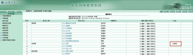 教务处审核确认后,学生于2015年4月8日-24日登录教务管理系统——学生学籍——辅修报名查看审核结果。通过资格审核后状态为“已批准”,如图2所示。