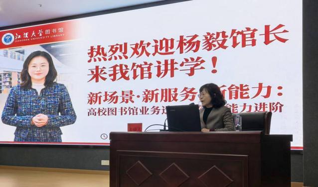 4月9日下午,“江汉大讲坛”在图书馆负一楼报告厅举办。讲座由阅读推广部主任周妍君主持,图书馆(档案馆)全体职工及学生代表参加。本次讲座邀请华中师范大学图书馆副馆长杨毅博士主讲,她以《新场景・新服务・新能力:高校图书馆业务迭代与馆员能力进阶》为主题,为我校师生带来一场立足于专业前沿的学术报告。