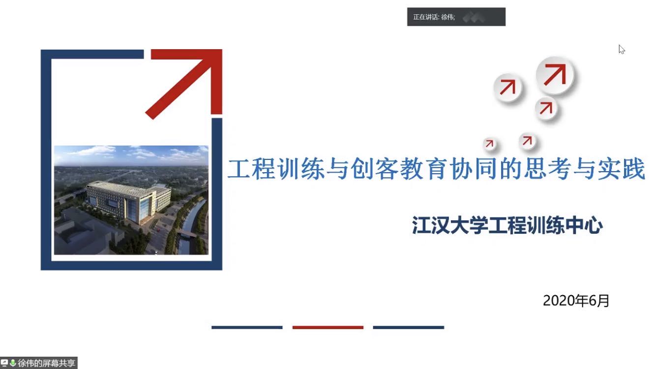 中南大区中南大学、华南理工大学、武汉大学、华中科技大学、武汉理工大学、华中农业大学、三峡大学、桂林电子科技大学、河南理工大学等11所高校的代表分别就工程训练、创客教育与实践、创新创业等内容,分享了工程训练与创客教育一线的经验及思考,会议同时通过网络小鹅通、Wiz直播云平台在线直播,受众人数1700多人。江汉大学工程训练中心徐伟老师作了题为《工程训练与创客教育协同的思考与实践》的汇报分享,内容包括江汉大学工程训练中心基本情况、构建工程训练与创客教育协同的平台、工程训练与创客教育协同的实践以及工程训练与创客教育的思考。