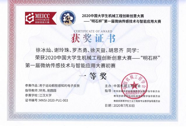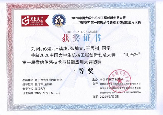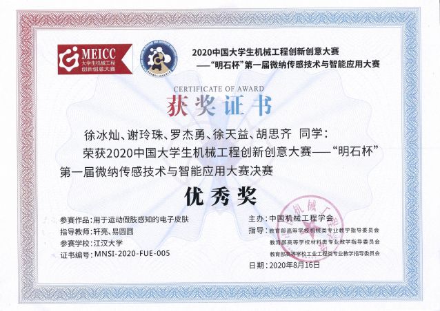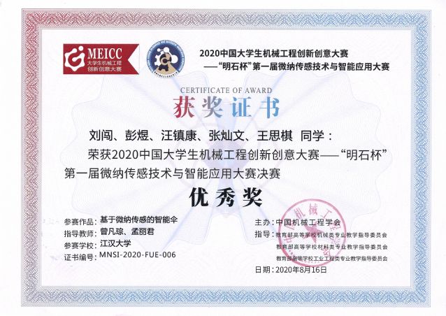 2020年8月14日-16日,中国大学生机械工程创新创意大赛-2020“明石杯”微纳传感技术与智能应用大赛决赛圆满结束。江汉大学智能制造学院组织的3支队伍以全国初赛一等奖的成绩闯入决赛,在山东烟台进行决赛的现场展示与问辩,与北京大学、浙江大学、西安交通大学、上海交通大学、郑州大学等国内众多一流高校同台竞技,其中2支队伍从本科生组18支决赛队伍中脱颖而出,进入全国前2/3的席位,取得了全国优秀奖的良好成绩。据悉本次大赛共有166所高校和研究机构的参赛队报名并参加初赛,最终只有18支本科生团队和40支研究生团队获得进入决赛的门票,只有12支本科团队和24支研究生团队获得决赛奖项,江汉大学成为本次大赛决赛唯一获奖的双非地方性院校。