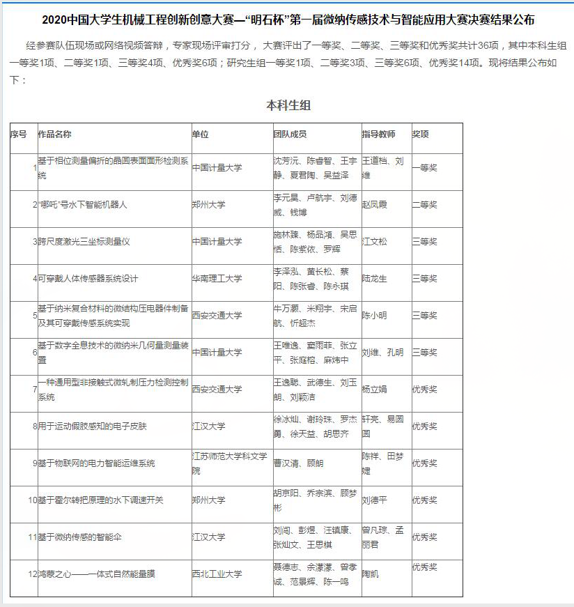 8月16日,2020中国大学生机械工程创新创意大赛——“明石杯”第一届微纳传感技术与智能应用大赛颁奖典礼暨院士论坛在烟台开发区举行。中国工程院院士蒋庄德、向锦武,中国机械工程学会秘书长陆大明,烟台市副市长张代令,烟台开发区工委书记、管委主任牟树青,共青团烟台市委书记相福亮出席活动并为选手颁奖。大赛旨在激发大学生对微纳传感技术的兴趣,启迪创新思想,培训传感器方面的专业人才;同时加快传感技术创新步伐,促进传感技术的产业化应用,进而推动我国传感技术的发展。